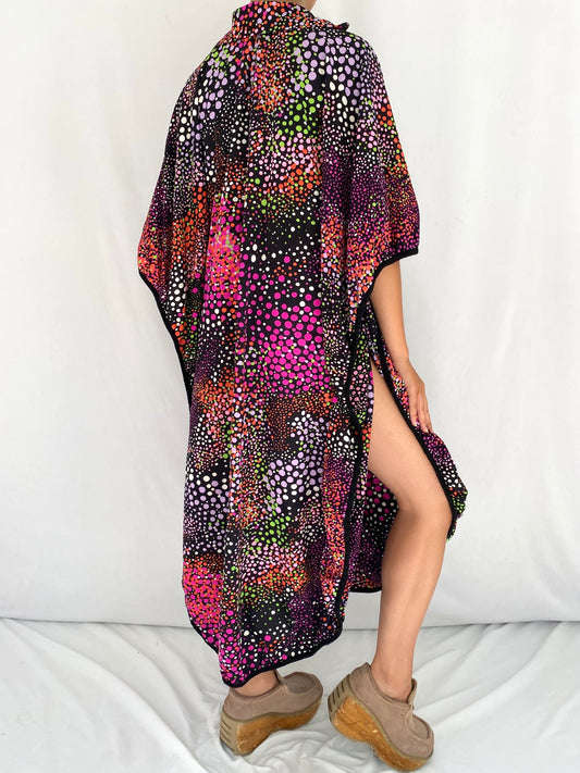 60s vintage multicolor polka dot psychedelic collared midi caftan dress – one size | bohemian vacation cover up sundress