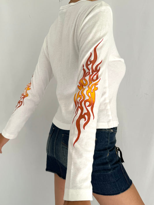 y2k vintage ON FIRE flames graphic long sleeved baby tee shirt – small | grunge rave club kid top