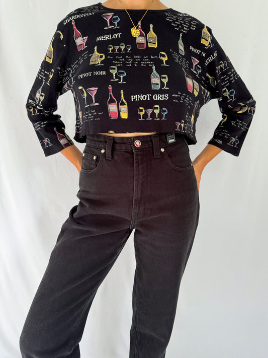 90s vintage black colorful wine lover graphic cropped shirt – medium | novelty print cotton crop top