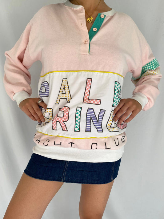 80s vintage pink palm springs california pullover sweater – medium, large | graphic quarter zip long sleeved sweatshirt