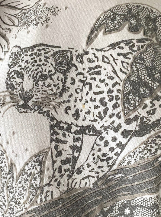80s vintage white black leopard animal print pullover sweater – small | tiger jungle retro glitter crewneck sweatshirt