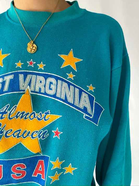 80s vintage turquoise blue west virginia USA pullover sweater – medium | bright graphic varsity crewneck sweatshirt