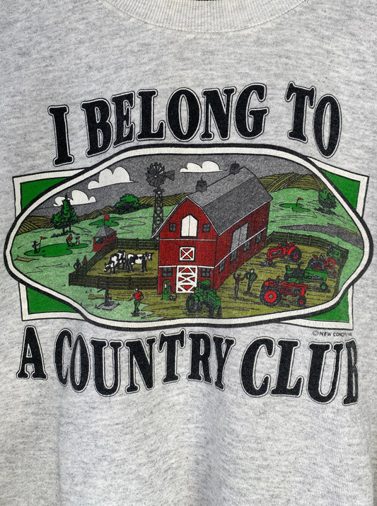 90s vintage grey country club farm graphic pullover sweatshirt – medium large | outdoor nature spellout unisex crewneck sweater