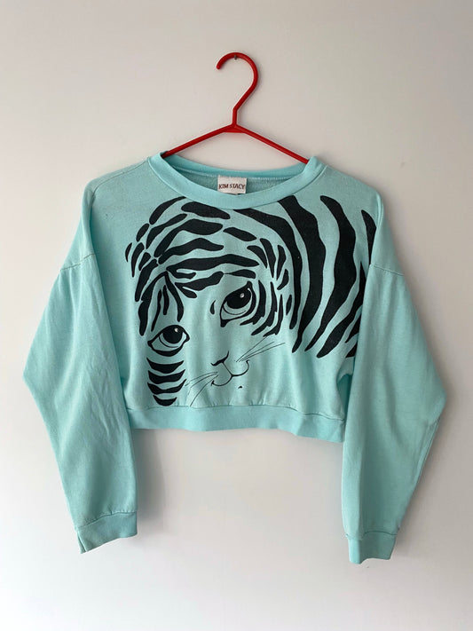 80s vintage light blue tiger face graphic cropped pullover sweater – small | novelty long sleeved jewel crop top