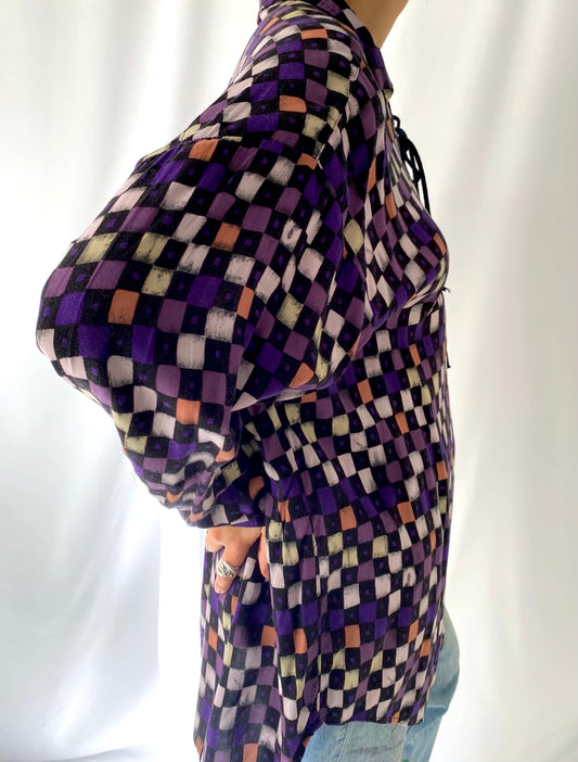 80s vintage purple checkered pullover blouse – medium, large | abstract artsy long sleeved collared shirt