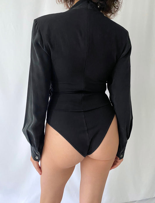 80s vintage long sleeved black pure silk blouse bodysuit with front tie bow - small, medium | dance party leotard one piece