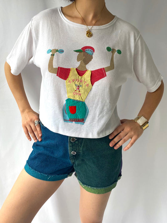 90s vintage white novelty athletic cartoon short sleeved tee shirt – small, medium | retro fitness cotton crop top