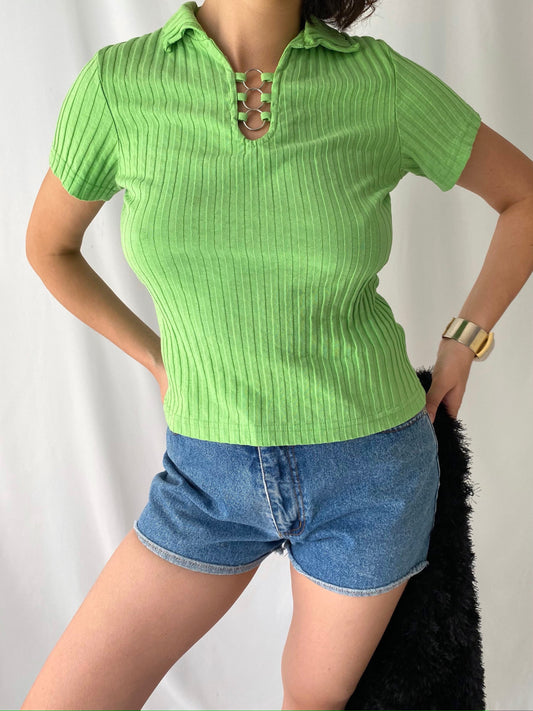 90s y2k vintage green ribbed short sleeved crop top – extra small, small | bright neon collared fun bratz shirt