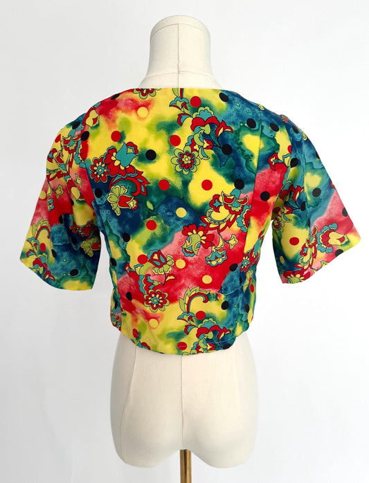 90s vintage multicolor baroque abstract print popcorn crop top | ornate funky stretchy textured crinkle scrunch stretch blouse
