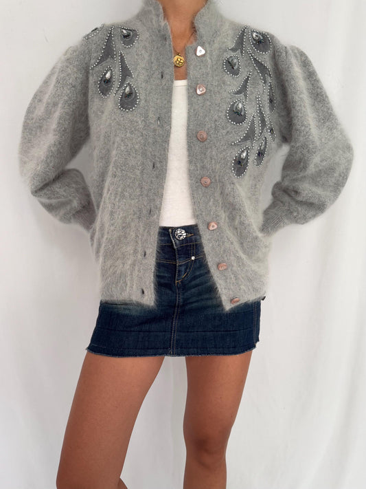 80s vintage grey angora beaded button up cardigan sweater – small medium