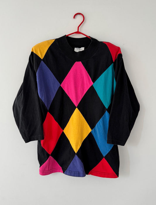 80s vintage black rainbow clowncore diamond patterned shirt – small medium