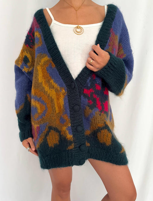 80s vintage multicolor mohair hand knit long button up cardigan – large