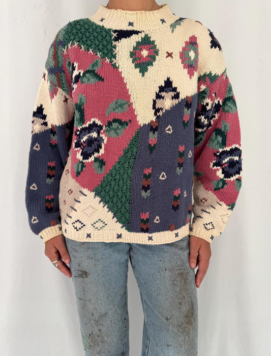 80s vintage floral patchwork granny thick hand knit sweater – medium