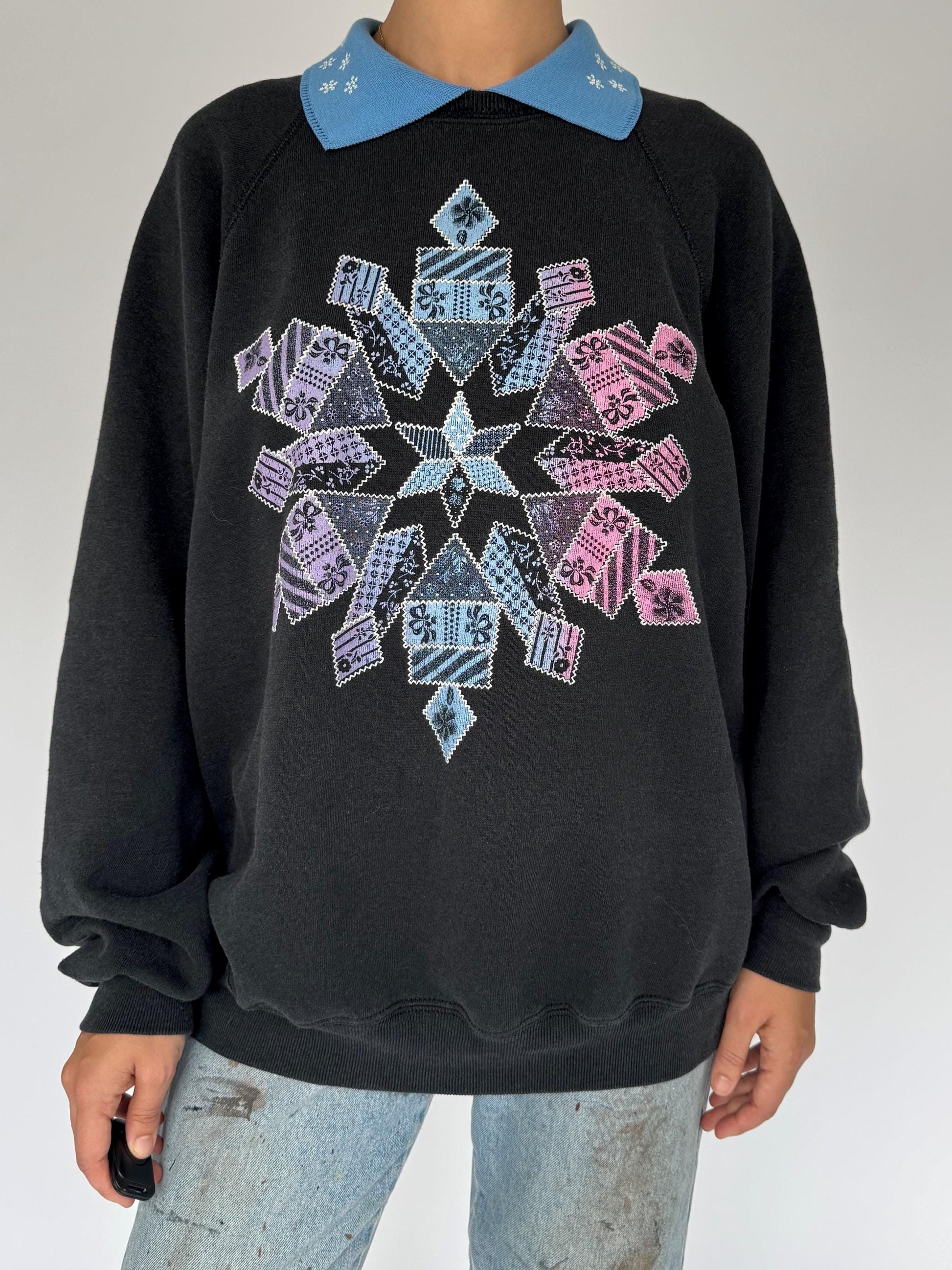 90s vintage black winter snowflake made in USA pullover sweatshirt – extra large