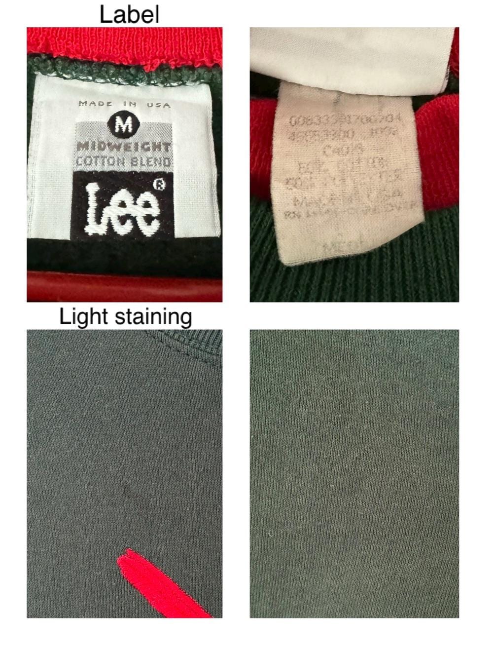 this is a festive sweatshirt "made in the USA" by Lee brand in the 90s featuring an embroidered graphic on the front of a red cardinal bird and a text that reads “williamsburg.” the long sleeved sweatshirt has a dark green body and a bright red double collar, and is made of a comfortable and thick cotton blend, with a fairly slim fit.