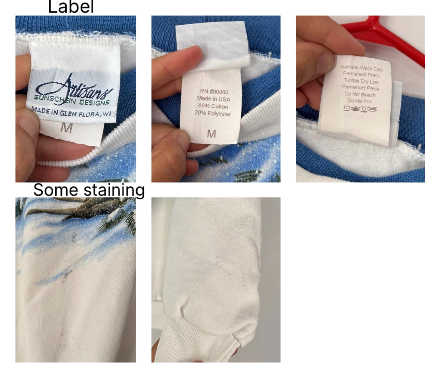 this is an incredible vintage sweatshirt “made in USA” by Artisans Sunschein Designs from the 90s featuring a wrap-around multicolor graphic of a snowy outdoor winter scene with wolves. the intricate print is all over the front, the back, and both sleeves, and the “snow” is made of a textured puff print! the long sleeved sweater features a double collar white and blue mock neckline, and the fabric is made of a high quality 80% cotton blend that is thick and comfortable - perfect for staying warm outdoors or for a cozy night in!